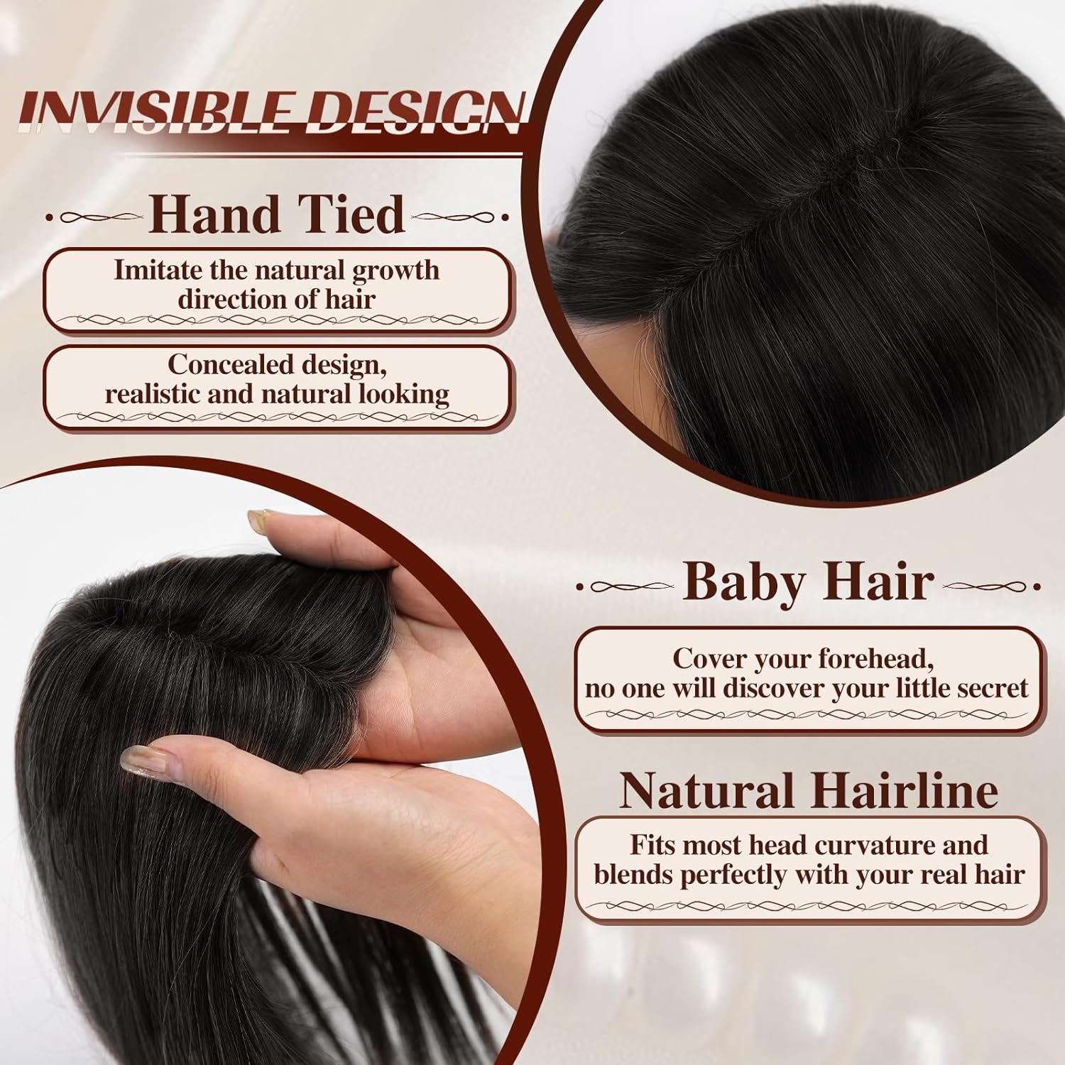 【Upgraded Invisible Swiss Base】: The realistic hair in the hair seam area is manually woven onto the Swiss base, looking like real hair. The upgraded Swiss base fits the curvature of the head better and is suitable for almost all types of heads. Concealed design perfectly blends the hair topper with your natural hair. Even if observed closely, no one can tell that you are wearing a hair topper. You can confidently and generously show off your new hairstyle.